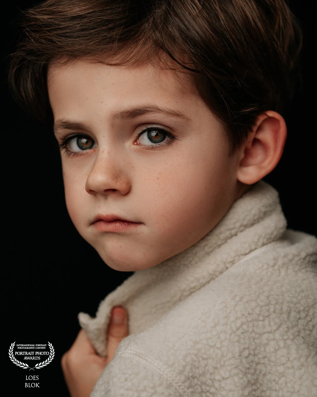 Close-up portret van een jong meisje met lichtblond haar en blauwe, grijze ogen. Ze kijkt recht in de camera met een rustige, dromerige expressie. De zachte, donkere achtergrond en het subtiele licht leggen de focus volledig op haar gezicht en geven het beeld een tijdloze, schilderachtige sfeer.