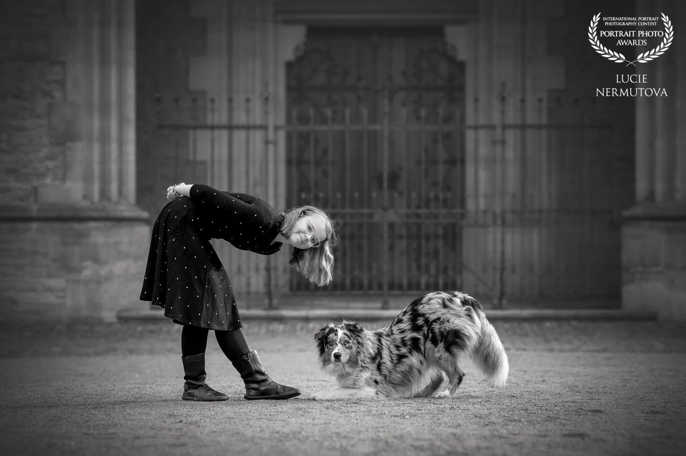 Two little sisters together with their sweet puppy Luz. Both dressed in beautiful princess gowns, letting themselves drift into a fairytale for a moment.