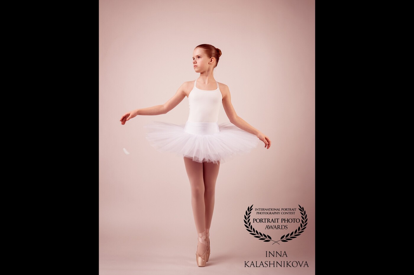 I want to name this work "Feather". Ballerinas are strong, flexible and graceful as a feather. This young ballerina wears traditional toe shoes and a tutu in white colors during the photoshoot.
