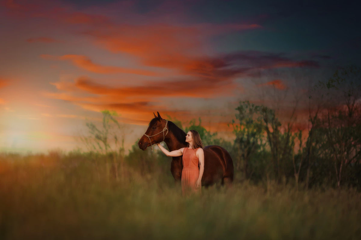 75th CollectionThis portrait of Mary and her horse Suzie is shot natural light at sunset with me crouched down in very tall grass. This was shot with a Nikon z6 and a Nikon 70-200 at 200mm f2.8.