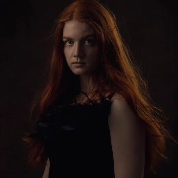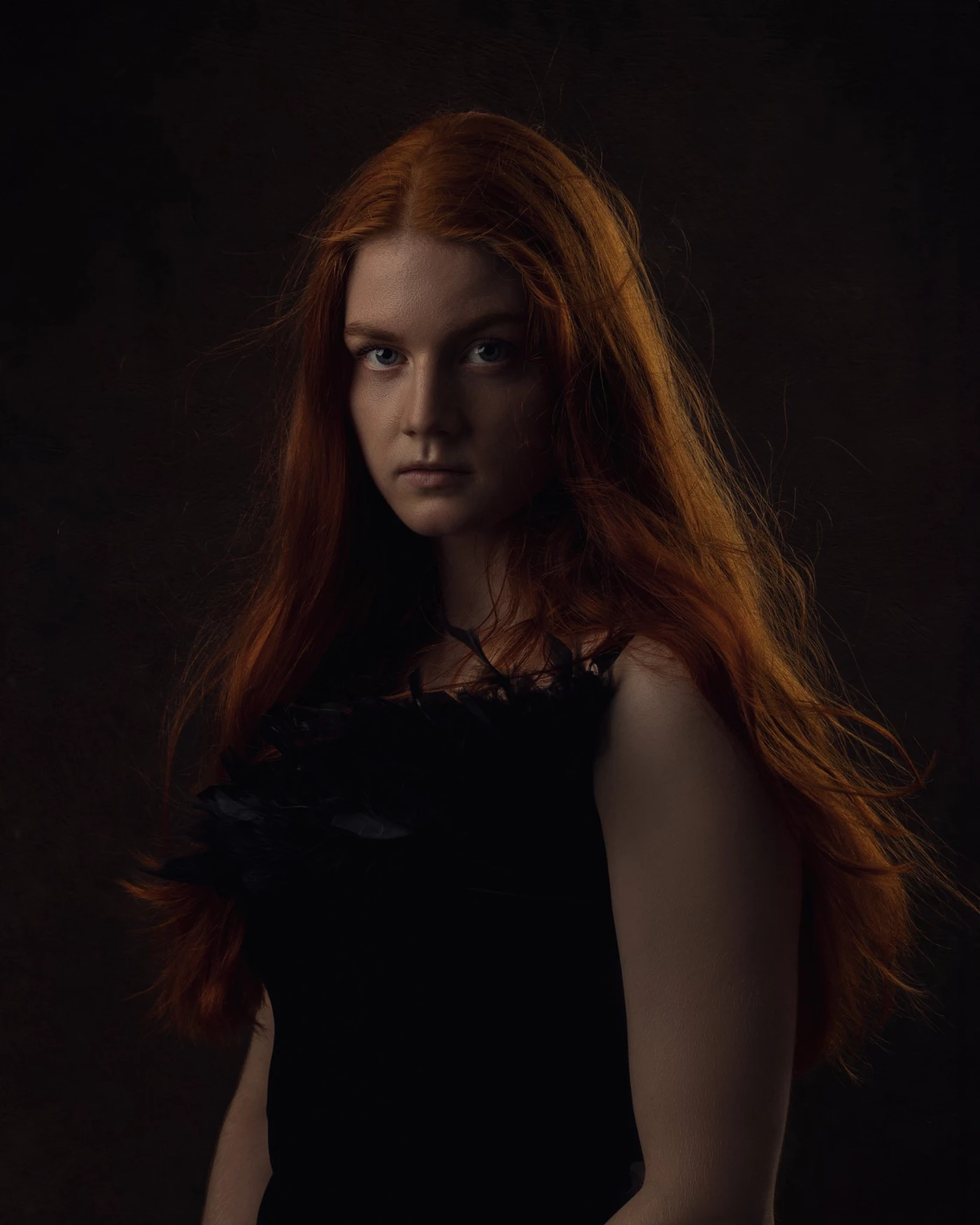 With Rembrandt lighting and a subtle rim light, her beautiful hair catches the light beautifully. The movement in her hair adds a vivid, almost cinematic feel to the portrait.