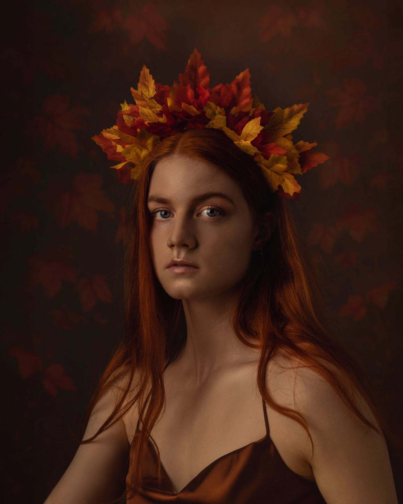 Met Dayenka during a masterclass in portrait photography. Coincidentally, she was recently in the area and stopped by for a shoot with masks. The beautiful handmade crown also had to be used, and with the light background and my favorite lighting setup, this stunning fine art photo was created.