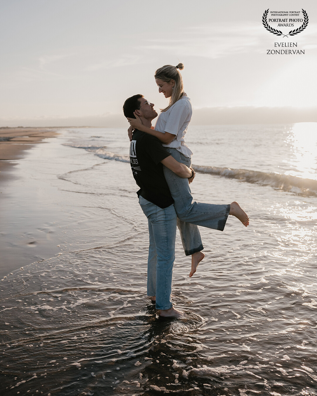 Britt & Pascal bij zonsondergang op het Zeeuwse strand.