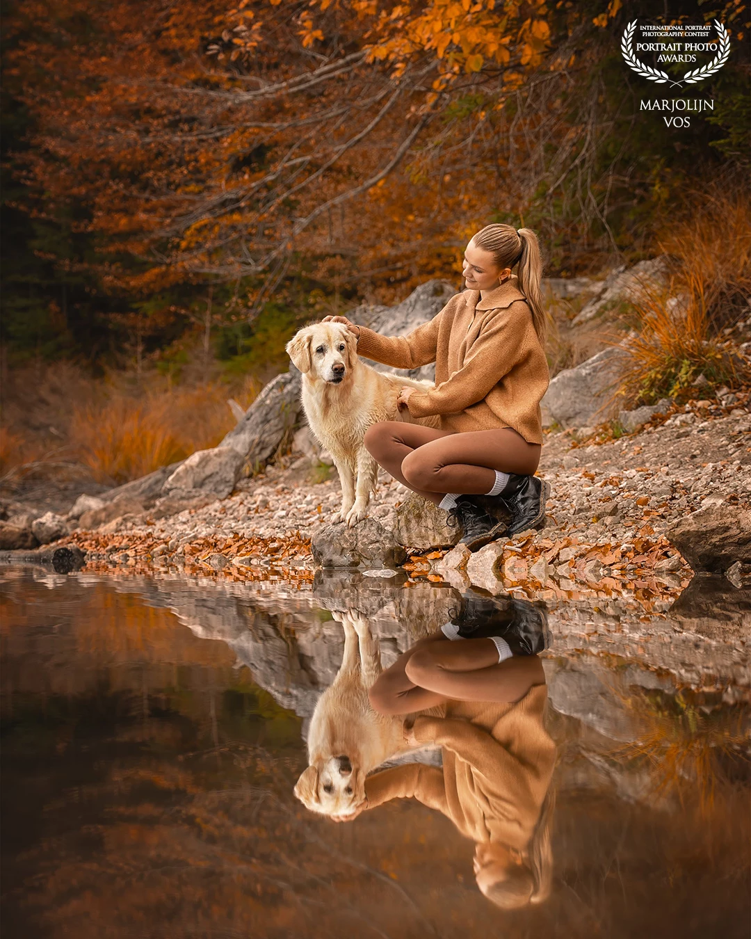 By the serene shores of the Haldensee, the woman and her dog stand side by side, eyes aligned, hearts connected. No leash needed, just quiet trust. The dog leans gently into her leg, and she rests her hand with ease on his back. The lake reflects more than just the mountains; it mirrors a bond built on love, loyalty, and pure companionship.