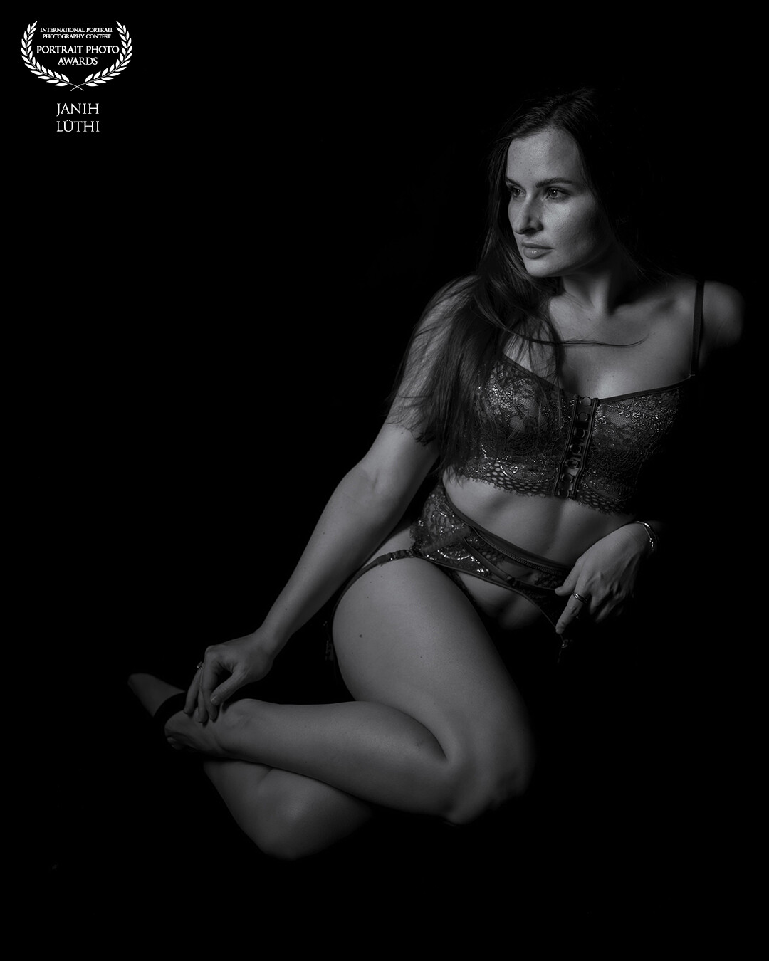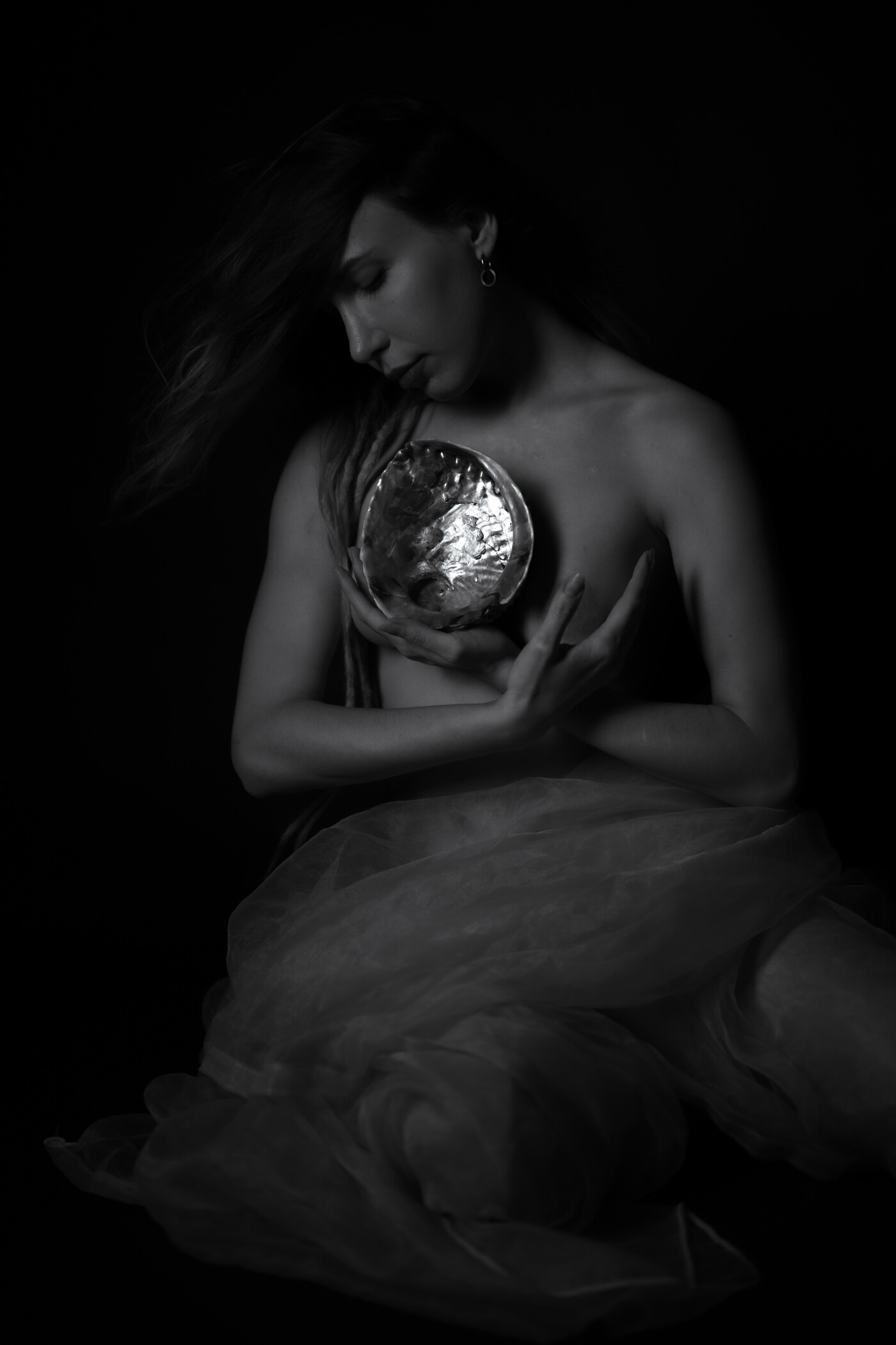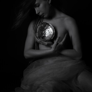 This black and white photograph captures the interplay of light and shadow, emphasizing vulnerability and intimacy. The stark contrasts draw attention to the subject's form and emotions, inviting viewers into a moment of quiet contemplation. Through elegant details and negative space, the artwork explores themes of solitude and self-reflection, highlighting the beauty in depth and expression.