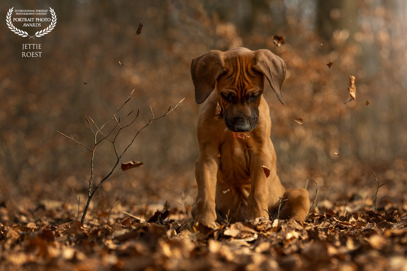111th CollectionHandsome 10 weeks old Rhodesian Ridgeback puppy Joop his first fotoshoot. He did it so well. His coat also matches the leaves of the beech tree beautifully. The falling leaves were very strange.