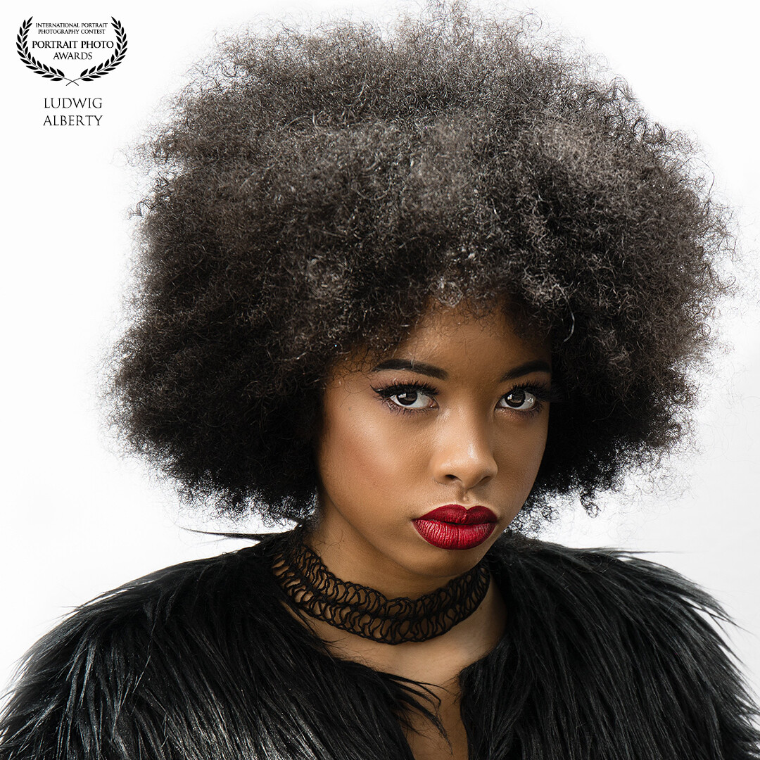 112th CollectionThis is a striking studio portrait of a woman with a bold and confident presence. She has a voluminous natural afro hairstyle and is wearing vivid red lipstick, which contrasts beautifully with her smooth, glowing skin. Her makeup is polished, with defined eyebrows, winged eyeliner, and long lashes that enhance her captivating gaze directed at the camera.