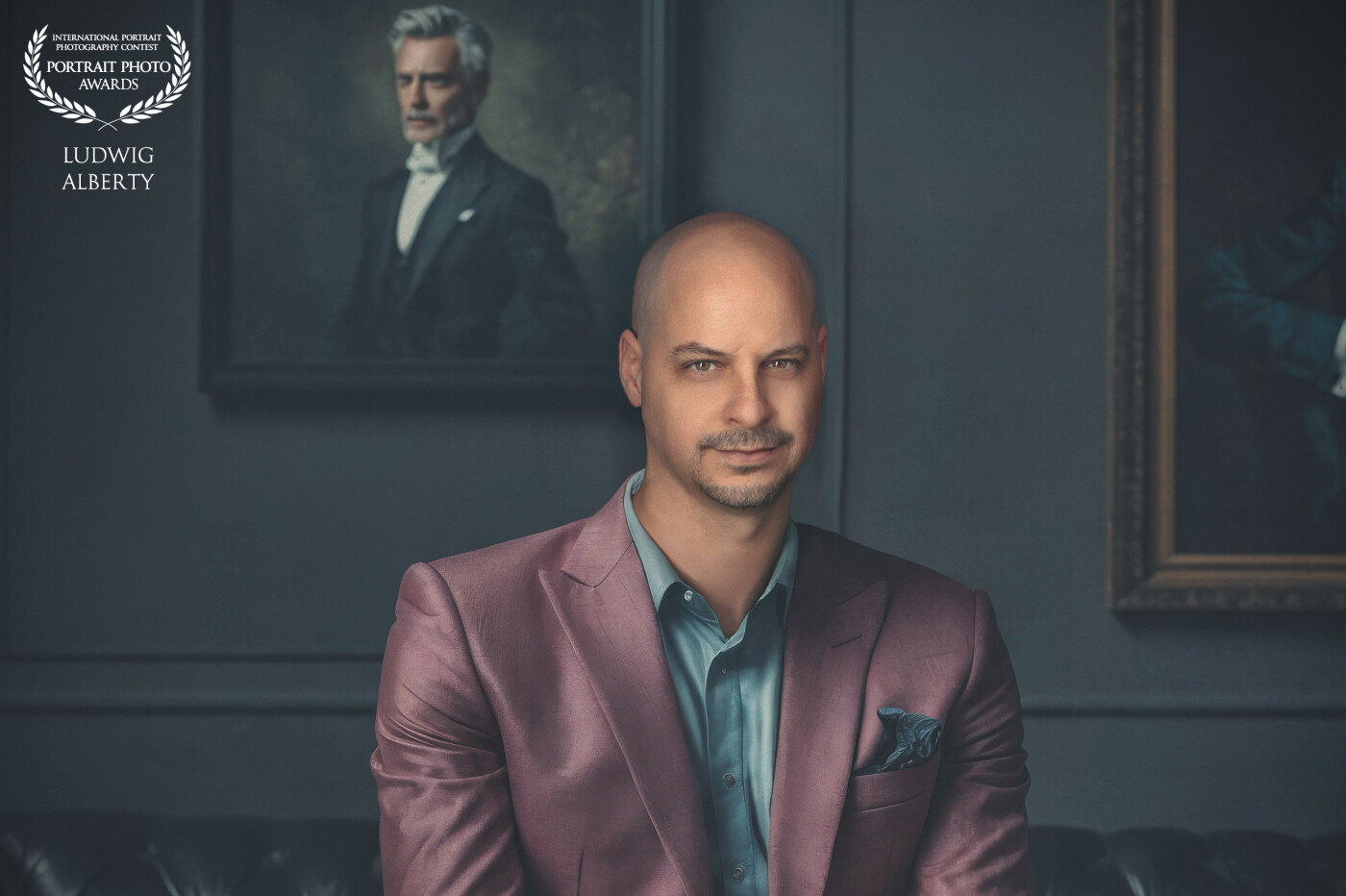 108th CollectionIn this moody, cinematic portrait, a man dressed in a sleek black suit sits confidently in a chair with legs crossed and hand thoughtfully placed at his temple, exuding authority and composure. He is positioned against a dark, elegant wall adorned with classic oil paintings of distinguished historical figures in ornate gold frames, evoking a sense of legacy and timeless power. The floor’s rich wood grain adds warmth to the otherwise cool, refined setting. A subtle spotlight highlights the man’s presence.