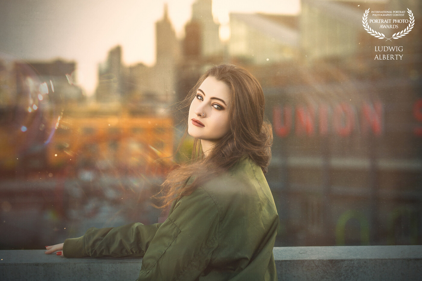 114th CollectionThe image depicts a young woman with long, flowing brown hair, leaning against a ledge with a cityscape blurred in the background, suggesting an urban setting during sunset or sunrise with warm orange and pink hues. features a dreamy, ethereal quality with light flares and bokeh effects.