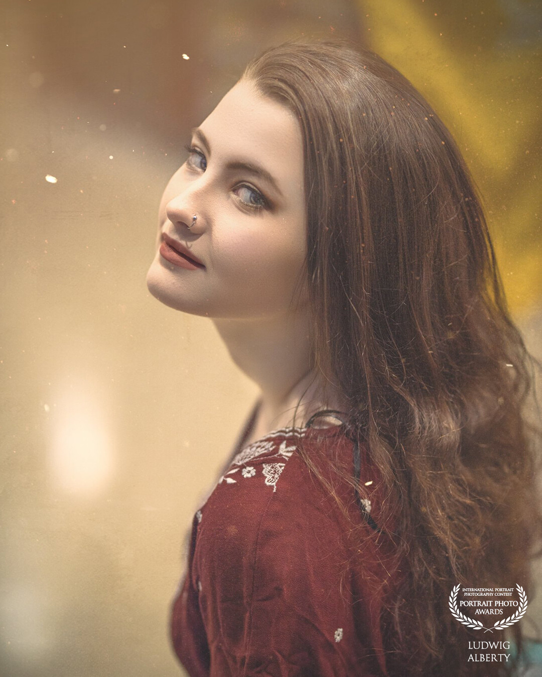 115th CollectionThe image shows a young woman posed in a soft, dreamy portrait style. She has long, wavy brown hair cascading over her shoulder and is wearing a deep red top with delicate white embroidery. Her head is tilted slightly back as she looks toward the camera with a gentle, confident expression. The warm, golden background and subtle floating particles give the photo an ethereal, almost vintage atmosphere. The lighting highlights her clear skin, blue eyes, and small nose piercing, creating a serene and elegant composition.