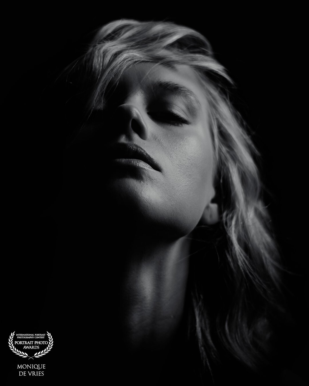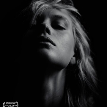 112th CollectionThis fine art black-and-white portrait captures a moment of serene intensity. With the face tilted upward and eyes gently closed, the composition evokes both vulnerability and quiet power. The sculpting effect of the low-key lighting accentuates the contours of the skin and hair, creating a dramatic interplay between shadow and light. A timeless image that embodies elegance, introspection, and strength.