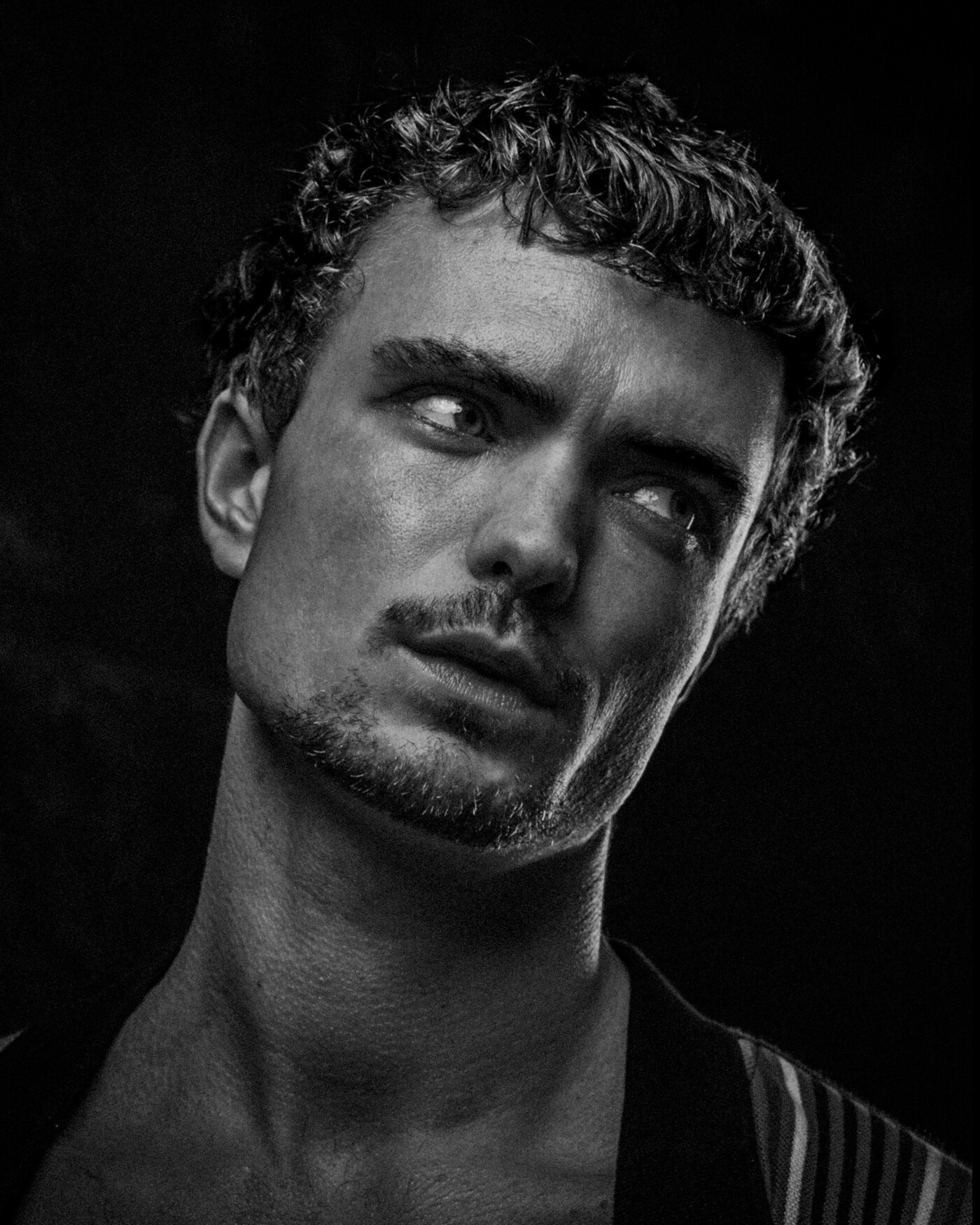A contemplative black-and-white portrait where shadow and light shape the emotion of the image. The soft, directional light caresses the subject’s face and hair, revealing subtle textures while leaving much in mystery. The upward gaze evokes quiet introspection, balancing vulnerability and strength. The fine gradation between darkness and light enhances the timeless, fine art quality of the portrait.