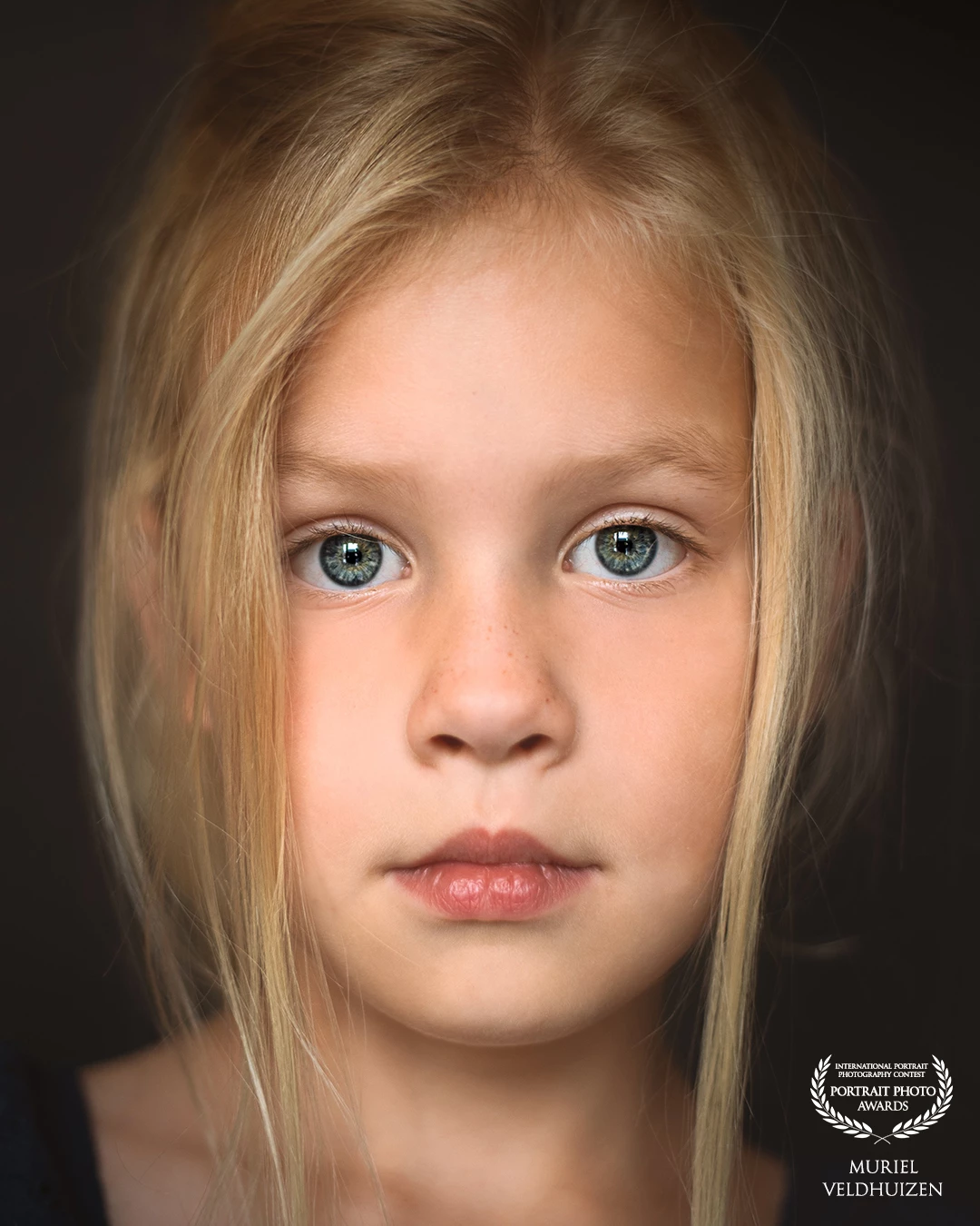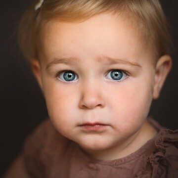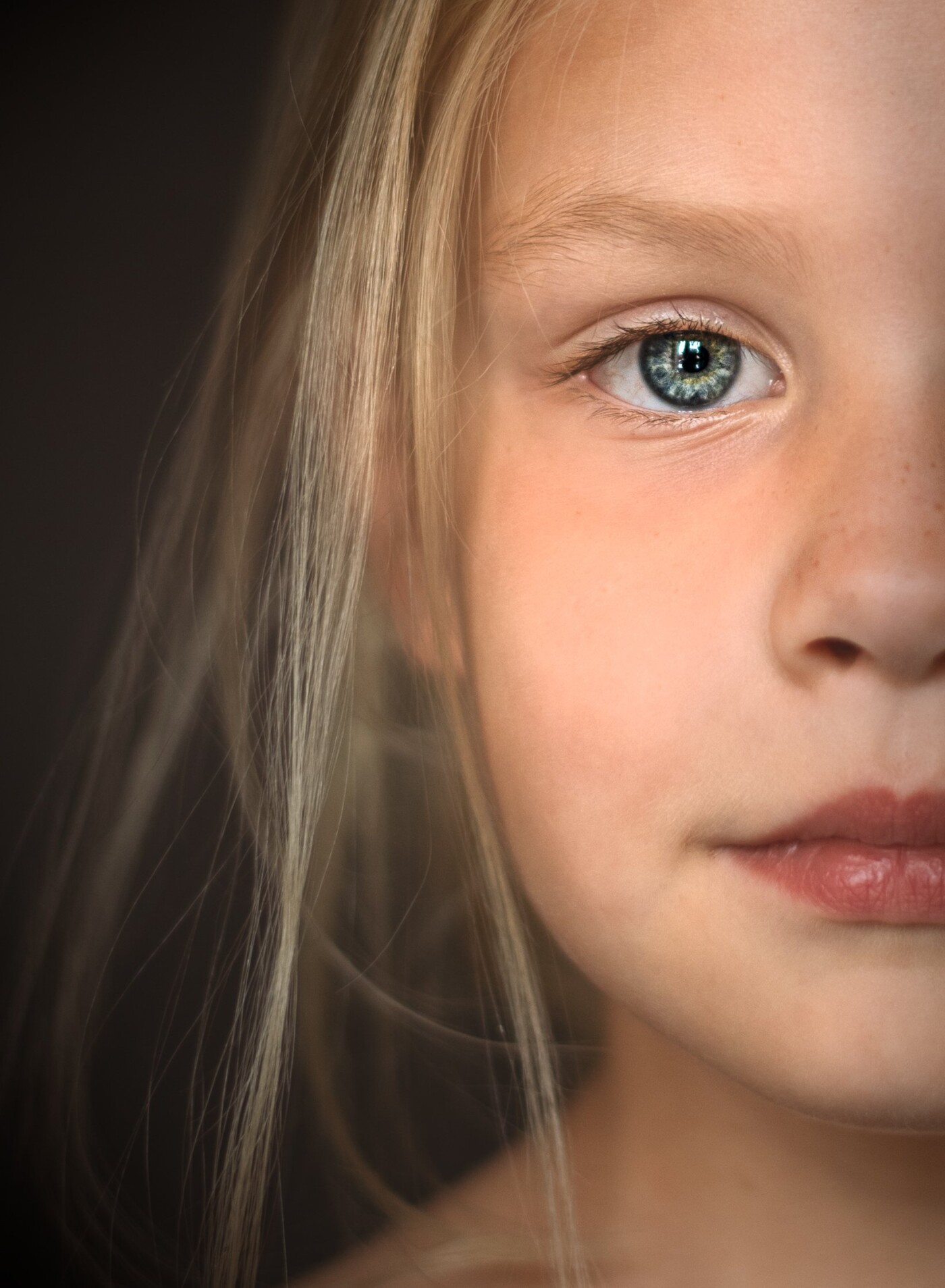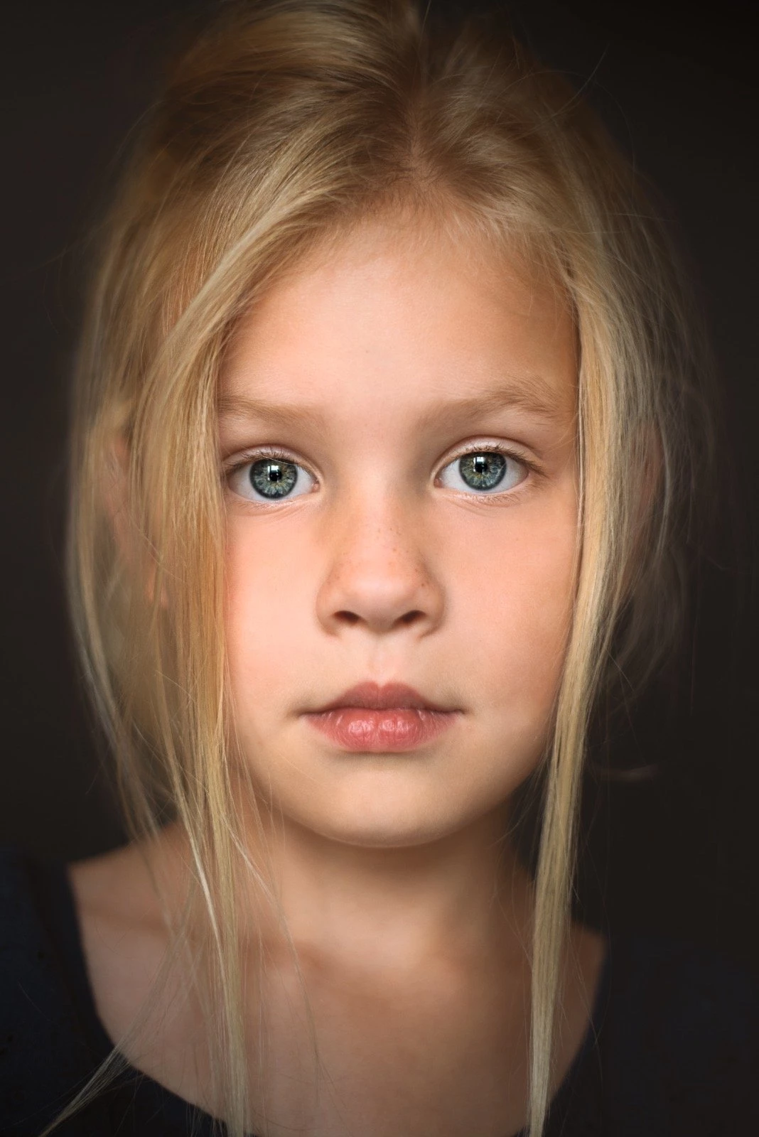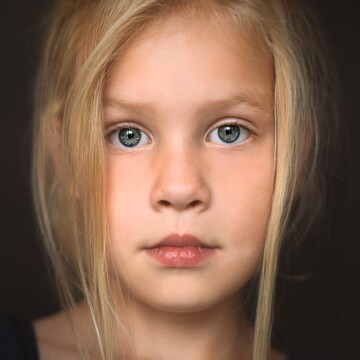 117th CollectionClose-up portret van een jong meisje met lichtblond haar en blauwe, grijze ogen. Ze kijkt recht in de camera met een rustige, dromerige expressie. De zachte, donkere achtergrond en het subtiele licht leggen de focus volledig op haar gezicht en geven het beeld een tijdloze, schilderachtige sfeer.