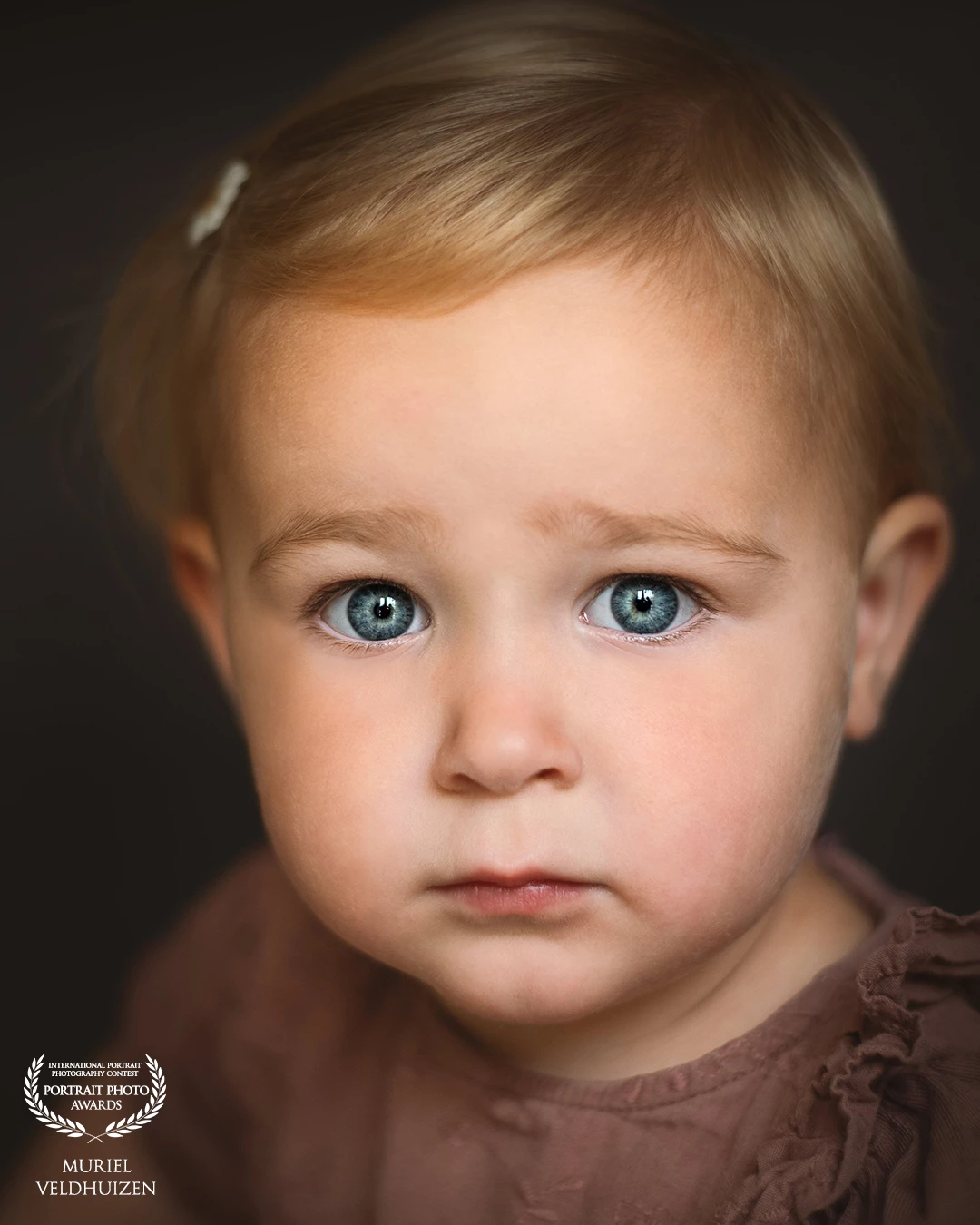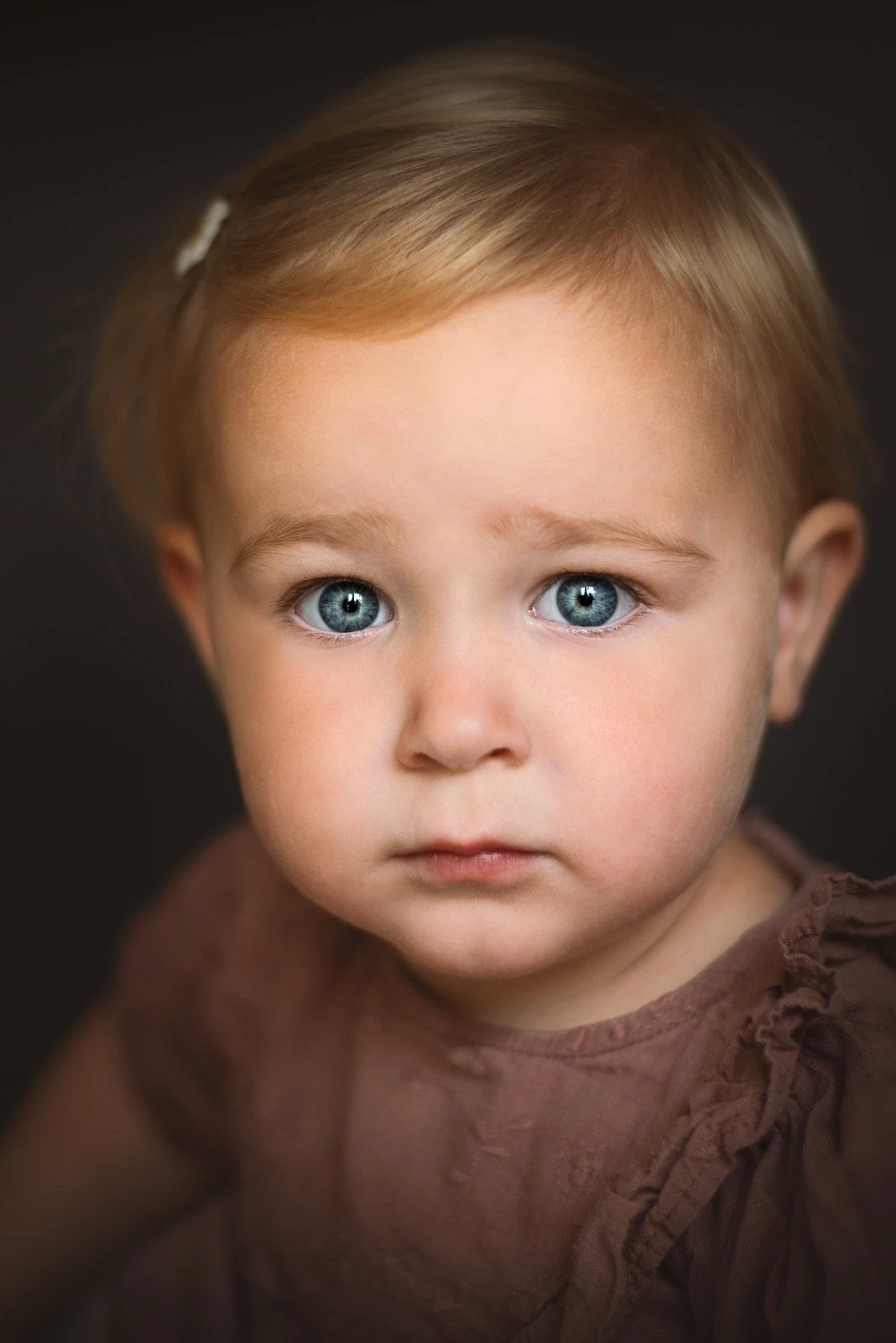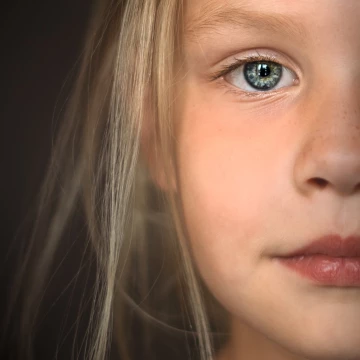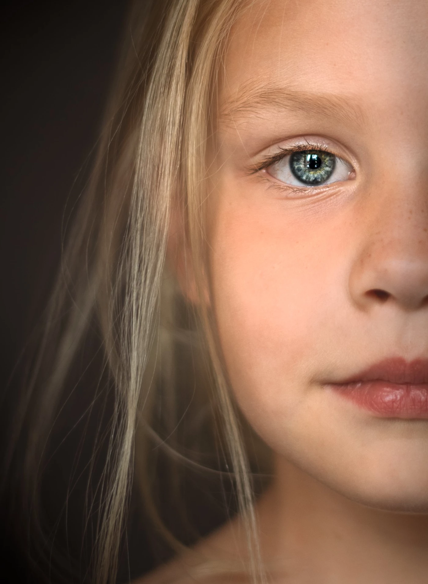 Close-up portret van een jong meisje met zacht blond haar en grote, heldere blauwe ogen. De blik is kwetsbaar en onderzoekend, wat een sterke emotionele connectie creëert. Het zachte, donkere licht en de rustige achtergrond zorgen ervoor dat alle aandacht naar de subtiele gezichtsuitdrukking gaat.