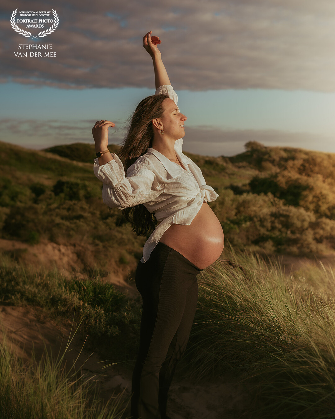 115th CollectionBathed in golden light, she embraces the quiet strength of motherhood with grace and serenity. This portrait captures a moment where hope, love, and new life rise together with the setting sun