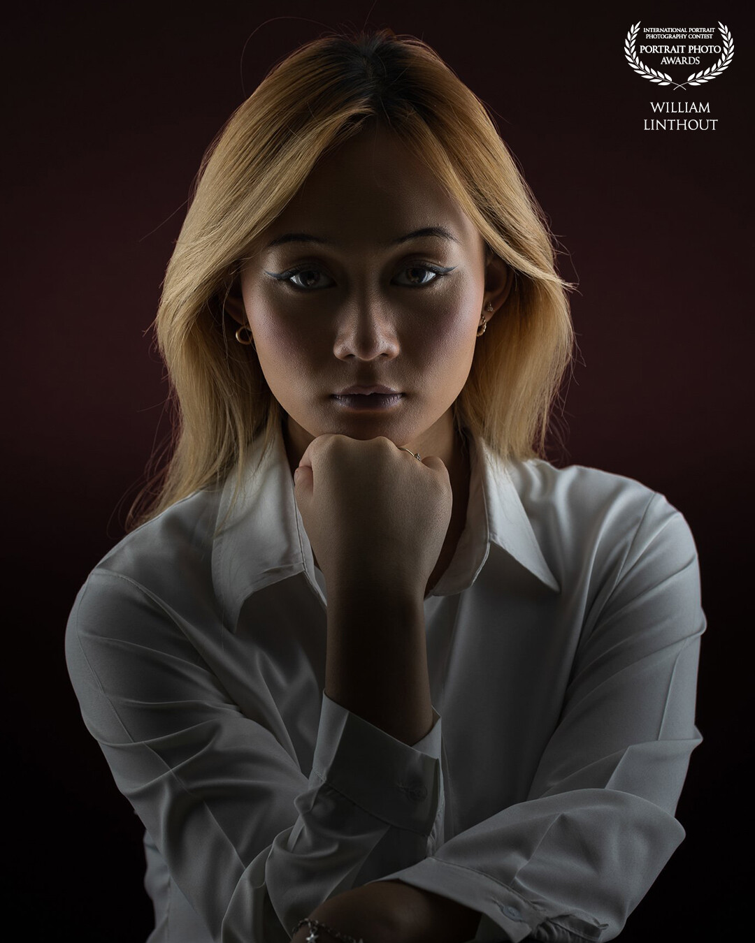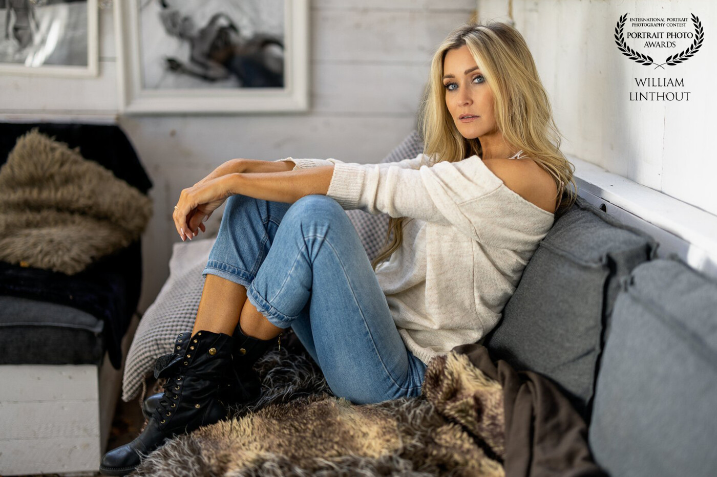 Deze foto werd gemaakt in een fotostudio met natuurlijk licht. De pose en de blik van het model komt zo de camera binnen.